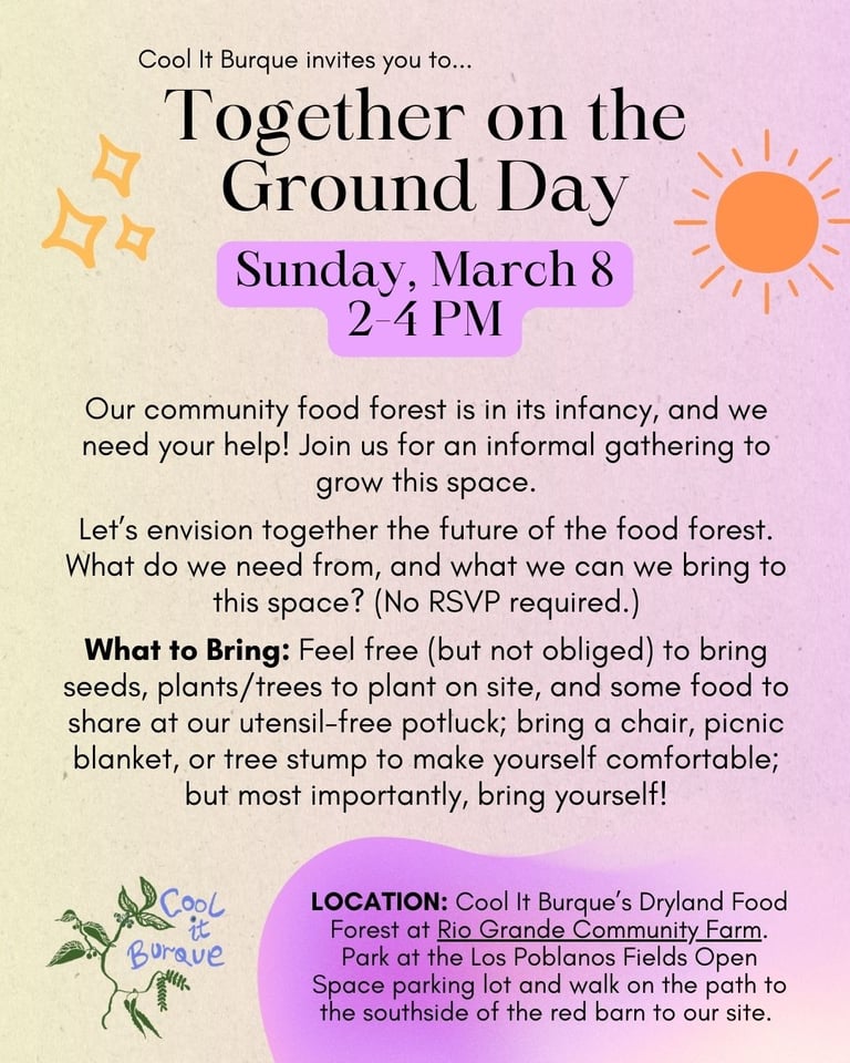This community food forest, where we can learn and share a new way of supporting ourselves by restoring our local ecosystem, needs a diversity of people as much as it needs a diversity of native and climate-adapted plants. And so this March 8, we invite you to attend the first of what we hope will be many gatherings where we can spend time together outdoors in this baby forest. We can get to know each other and collaborate to grow ourselves a Cool It Burque culture and a thriving food ecosystem. We also want to acknowledge indigenous knowledge and culture, the indigenous lands we live on, and to invite indigenous people to join us. We invite you to help us make space for everyone, and we want to hear from you – what are you excited about, working on, wondering about? What do you want to bring to or need from this new food forest, literally and culturally?